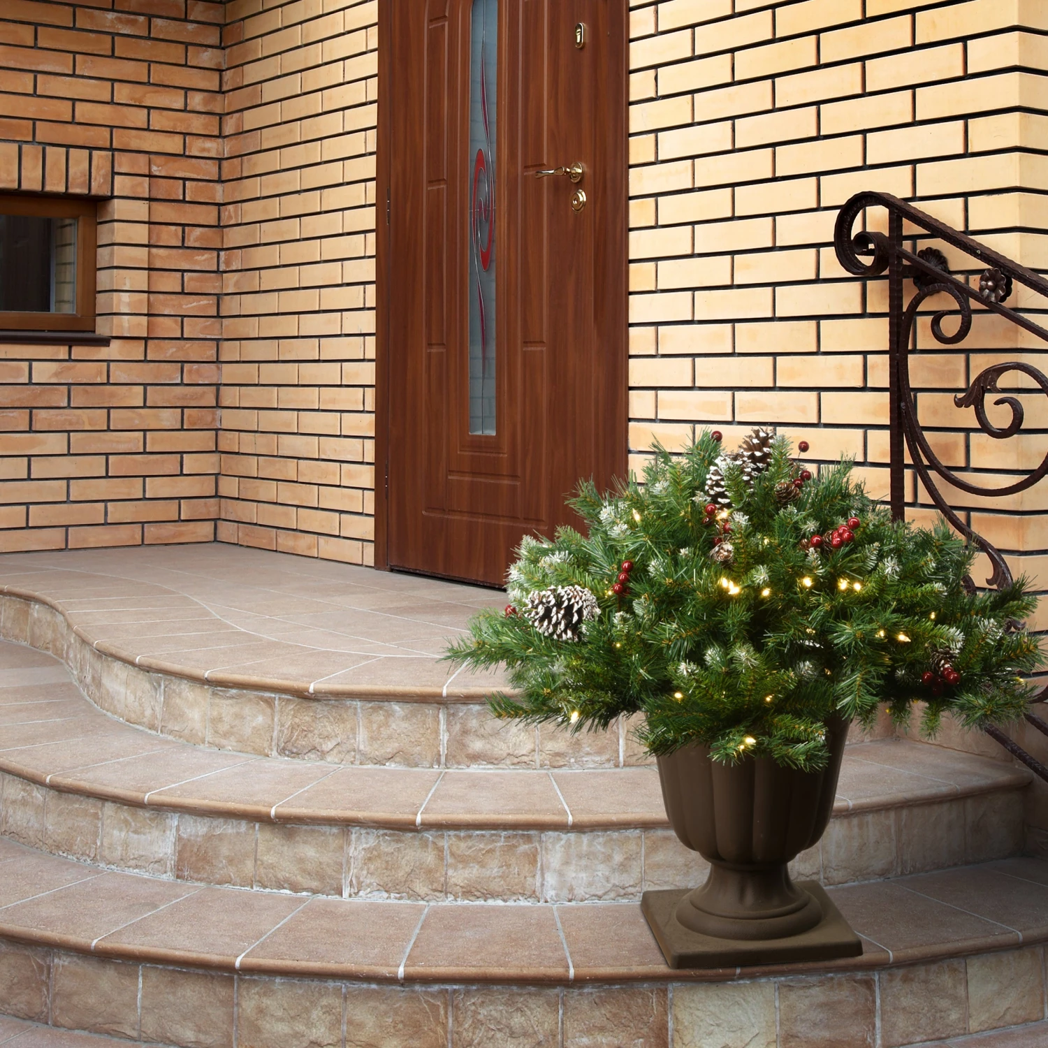 - Trimmed with red berries and pine cones