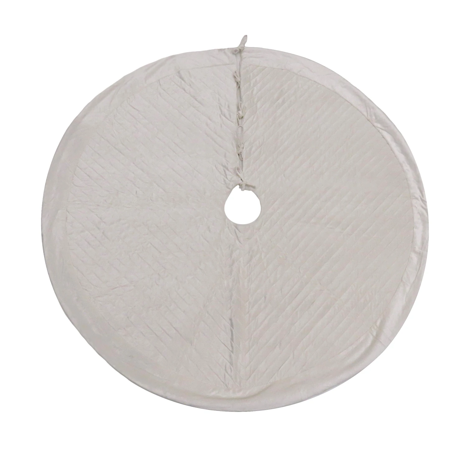Add a vibrant finishing touch to your Christmas centerpiece with this bright white velvet tree skirt. Made with a mixture of cotton and polyester materials, this skirt features a decorative straight-line quilted stitching and wide border. The split seam design allows for easy placement with four ties included to close and secure the seam.