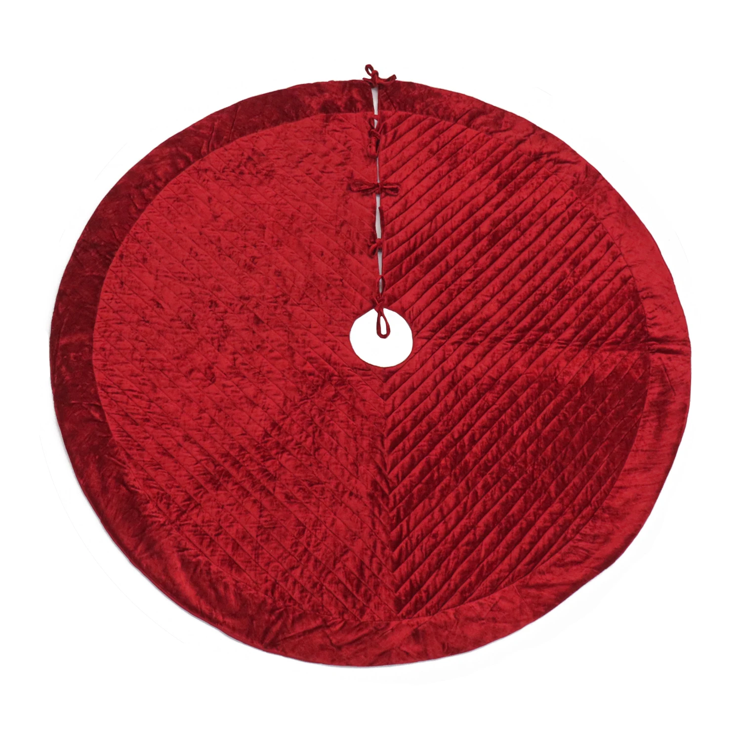 Add a rich, vibrant finishing touch to your Christmas centerpiece with this deep red velvet tree skirt. Made with a mixture of cotton and polyester materials, this skirt features a decorative straight-line quilted stitching and wide border. The split seam design allows for easy placement with four ties included to close and secure the seam.