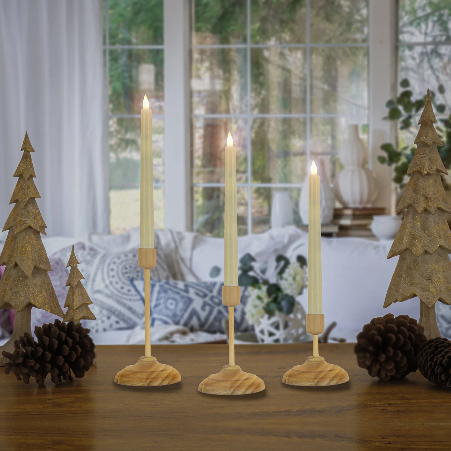 Battery operated with remote controlled functions, these three flameless candles produce a realistic, soft, and safe candle glow. The smooth, ivory color candle surfaces are crafted with real wax, and each is seated in a decorative long stem candleholder constructed of wood with a natural finish. A handheld remote control operates the lifelike candle flame with functions that include brightness, flicker speed, and timer settings. Set uses a total of six AAA size batteries (not included).