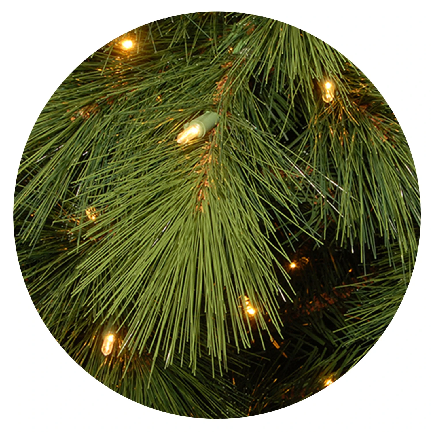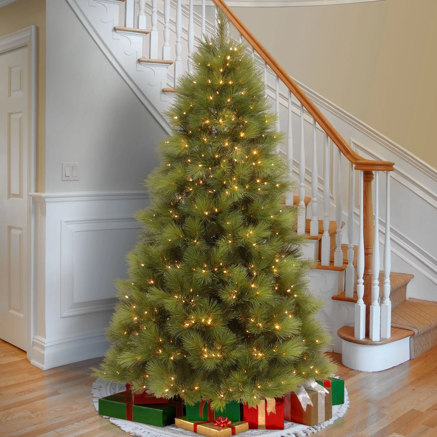 - This Arcadia Pine Pre-Lit Artificial Green Christmas Tree is 7.5 feet tall with a 57 inch base diameter. Featuring hundreds of ‘Feel Real’ individually crafted branch tips to create full bodied branches, this tree is designed to look and feel lifelike.